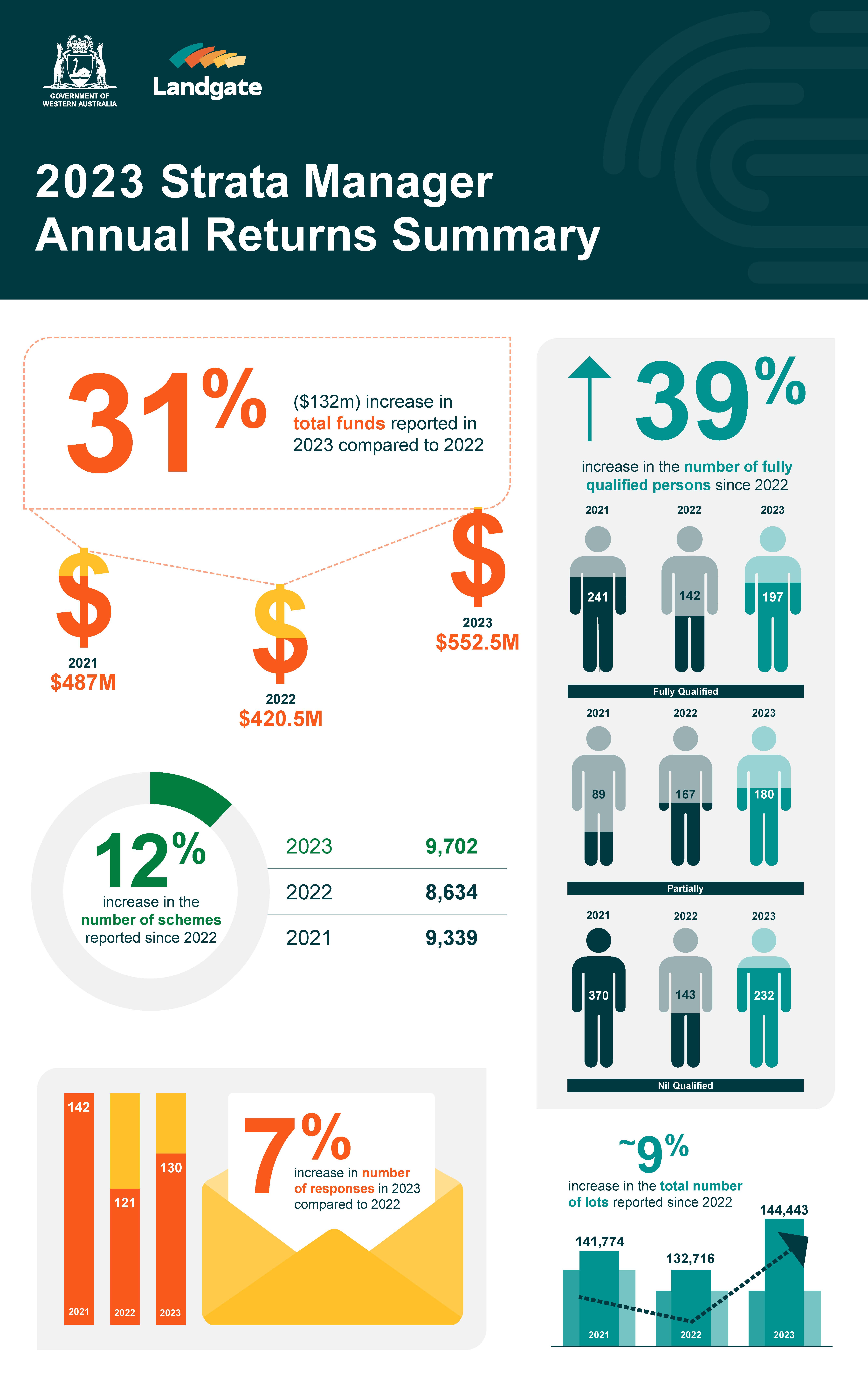 The 2023 Strata Manager Annual Return findings are now available. Landgate has compiled the results of the 2023 annual returns into an infographic comprising topline insights, as well as a more detailed presentation which includes analysis of responses across all sections of the survey.